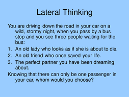 A man is trapped in a room. Lateral thinkingyou are driving down the road in your car on a wild he does so, and a male voice answers. There are so many puzzles for which if someone reads the statement, it will not make any sense. Answer of this lateral thinking picture puzzle, can be viewed by clicking on button. You are driving down the road in your car on a wild, stormy night, when you pass by a bus stop and you see three people waiting for the bus: